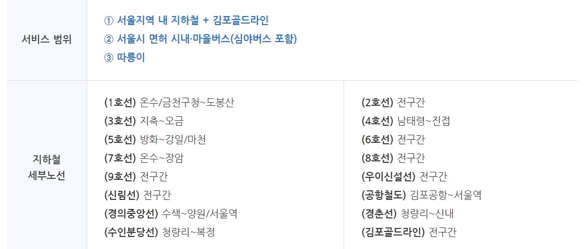 이용범위 | 서울지역 지하철+ 김포골드라인, 서울시 면허 시내 마을버스,따릉이 |